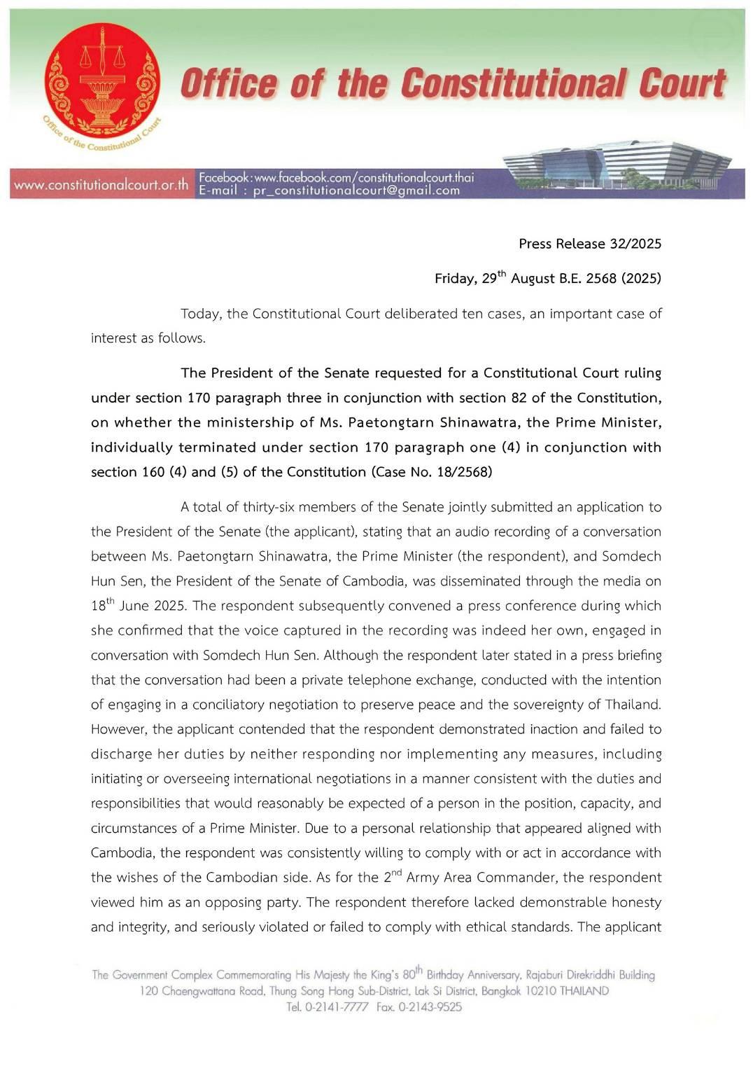 De zaak, aangespannen door een groep van 36 conservatieve senatoren, beschuldigde Paetongtarn van schending van de grondwettelijke bepalingen die ministers verplichten om "duidelijke integriteit" te tonen en zich aan ethische normen te houden. Centraal in de controverse stond een audio-opname van 15 juni, openbaar gemaakt door Hun Sen, waarin Paetongtarn de Cambodjaanse senaatsvoorzitter aansprak als "oom" en een hoge Thaise militaire commandant haar "tegenstander" noemde tijdens discussies gericht op het de-escaleren van een explosief grensconflict. Critici, waaronder nationalisten en militaire supporters, stellen dat haar opmerkingen de Thaise soevereiniteit ondermijnden, een buiging maakten voor een buitenlandse leider en de reputatie van de strijdkrachten schaadden, met name in de aanloop naar dodelijke gevechten eind juli, waarbij meer dan 40 mensen omkwamen en meer dan 300,000 mensen langs de grens ontheemd raakten.