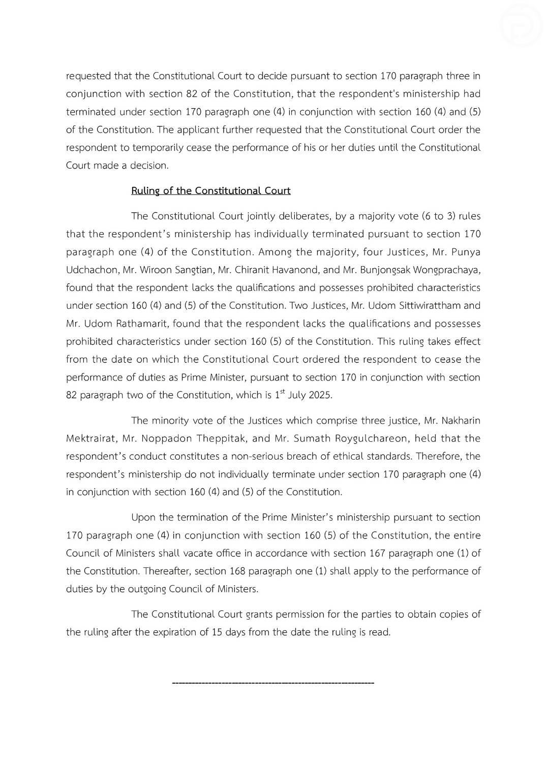 Het Constitutionele Hof kwam vandaag om 9 uur lokale tijd bijeen om te beraadslagen. De uitspraak werd om 30 uur gedaan. Ze werd schuldig bevonden, wat betekent dat ze uit haar ambt zal worden ontheven en dat er een nieuwe premier zal worden gekozen.